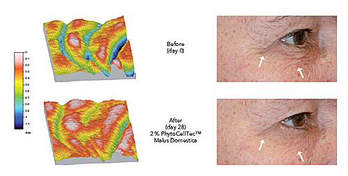 The anti-wrinkle effect of PhytoCellTec Malus Domestica was evaluated in a study with 20 volunteers aged from 37 to 64. An emulsion containing 2% of PhytoCellTec Malus Domestica was applied twice daily for 28 days to the crow's feet. Wrinkle depth was determined by means of PRIMOS (phase-shifting rapid in vivo measurement of skin). Results showed a significant and visible decrease in wrinkle depth for 100% of the subjects.