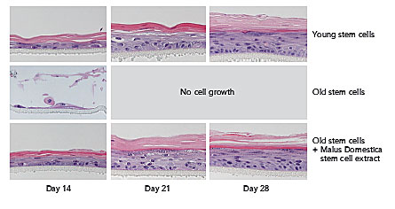 - But, if treated with Malus Domestica stem cell extract from their early passage, "old" epidermal stem cells retain their capacity to form a stratified epidermis.
